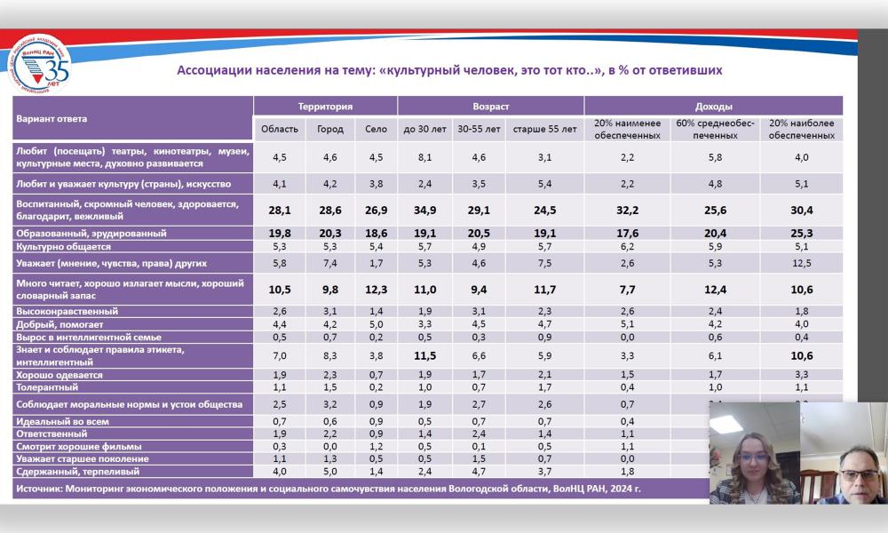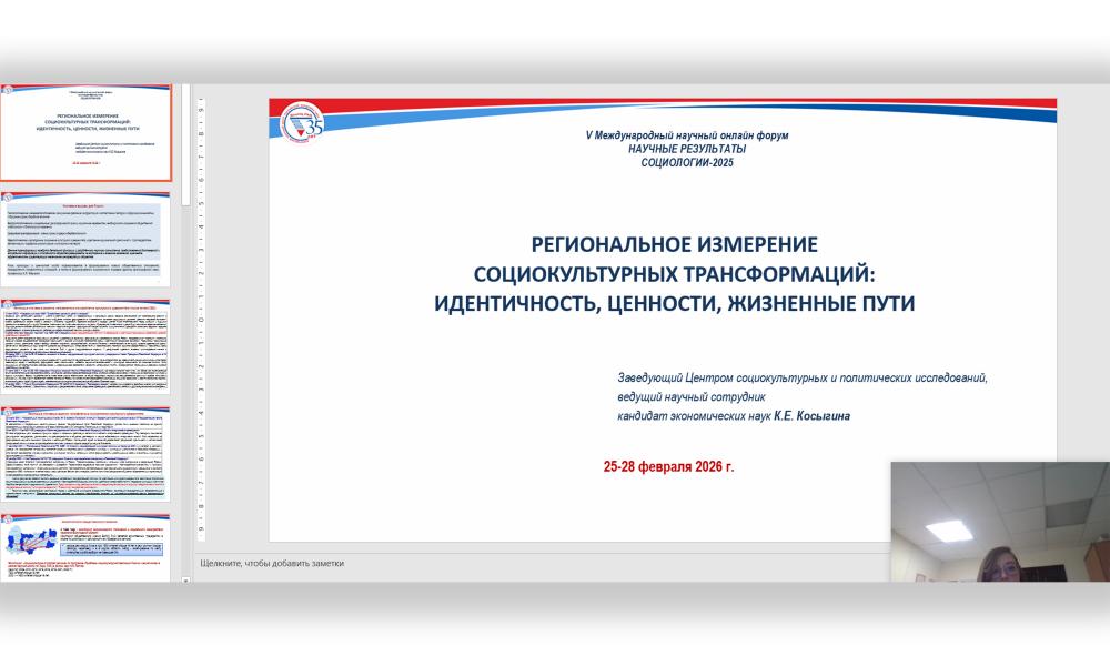 Вологодский научный центр РАН на форуме представили сотрудники Центра социокультурных и политических исследований. На пленарном заседании, посвященном научным результатам в социологии культуры и религии, выступила в.н.с., зав. Центром к.э.н. Ксения Евгеньевна Косыгина. В своем выступлении на тему «Региональное измерение социокультурных трансформаций: идентичность, ценности, жизненные пути» она представила результаты многолетнего мониторинга ВолНЦ РАН. Исследование, посвященное ценностным ориентациям жителей Вологодской области, выявило устойчивый приоритет нематериальных ценностей. Согласно полученным данным, ключевыми жизненными траекториями для вологжан остаются создание счастливой семьи и воспитание детей. Вместе с тем в докладе были отмечены тревожные тенденции: в региональном сообществе фиксируются риски, связанные с обесцениванием профессии, знаний и высшего образования.